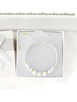 Głównym elementem tej bransoletki są matowe, białe kamienie howlitu – minerału znanego z działania uspokajającego i wspierającego wewnętrzną równowagę.