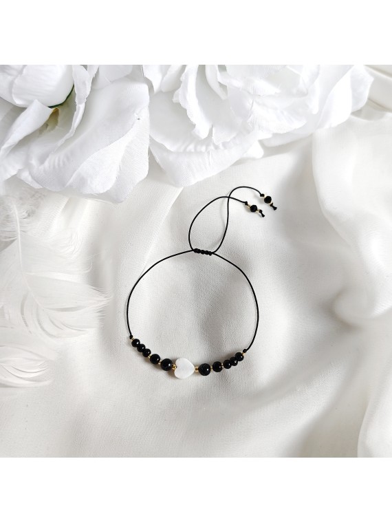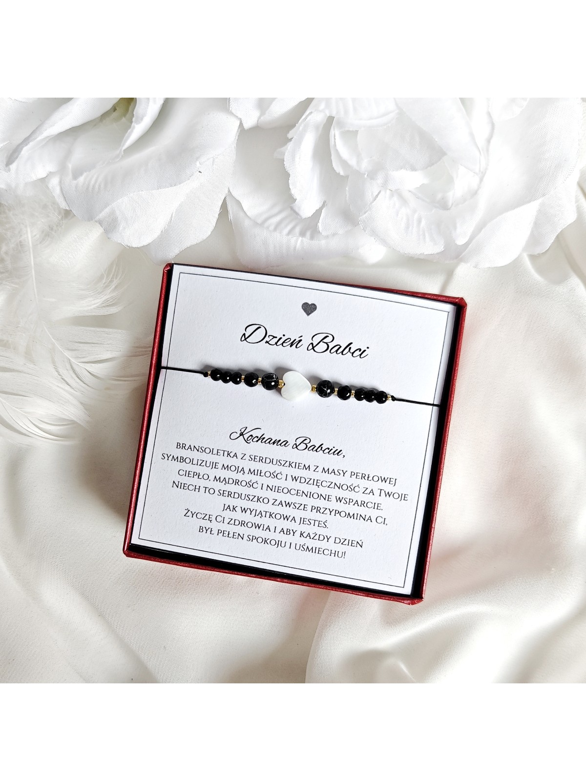 Ręcznie wykonana bransoletka na czarnym sznurku z Sercem z masy perłowej, onyksem, howlitem i jadeitem to biżuteria stworzona z myślą o Dniu Babci.