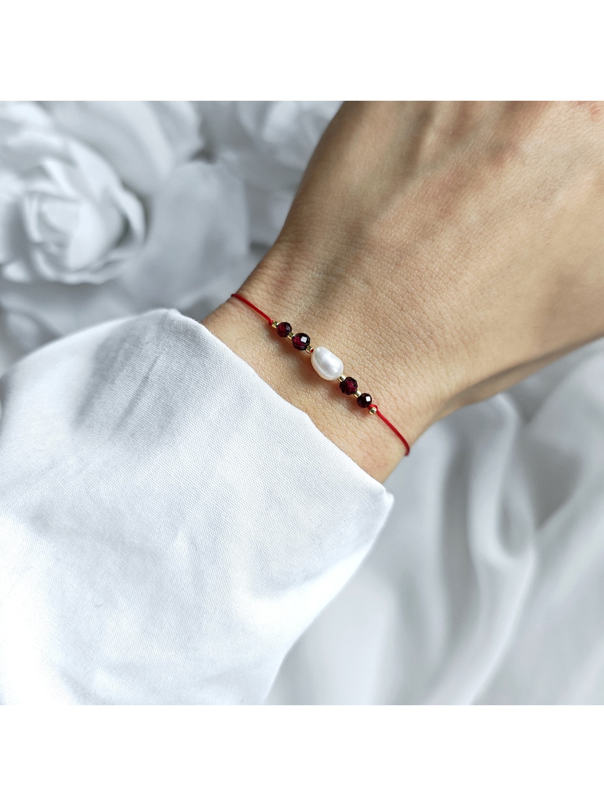 Bransoletka szczęścia z perłą i granatem, wykonana ręcznie na zamówienie, na czerwonym sznurku uznawanym w tradycjach za amulet ochronny, przyciągający szczęście, sprzyjający dobrym decyzjom i wzmacniający pozytywną energię.