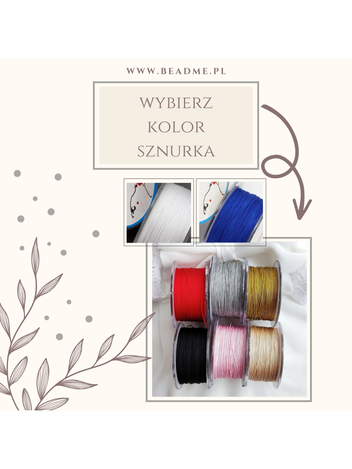 Możesz wybrać kolor sznurka spośród dostępnych opcji oraz odcień ozdobnych koralików – złoty lub srebrny.