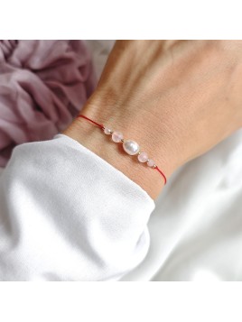 Bransoletka z perłą i kwarcem różowym na czerwonym sznurku