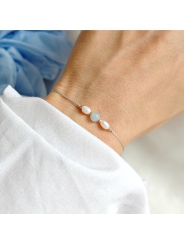 Akwamaryn umieszczony w centrum bransoletki przyciąga uwagę kolorem i strukturą, a dwie perły po bokach tworzą z nim idealną kompozycję.