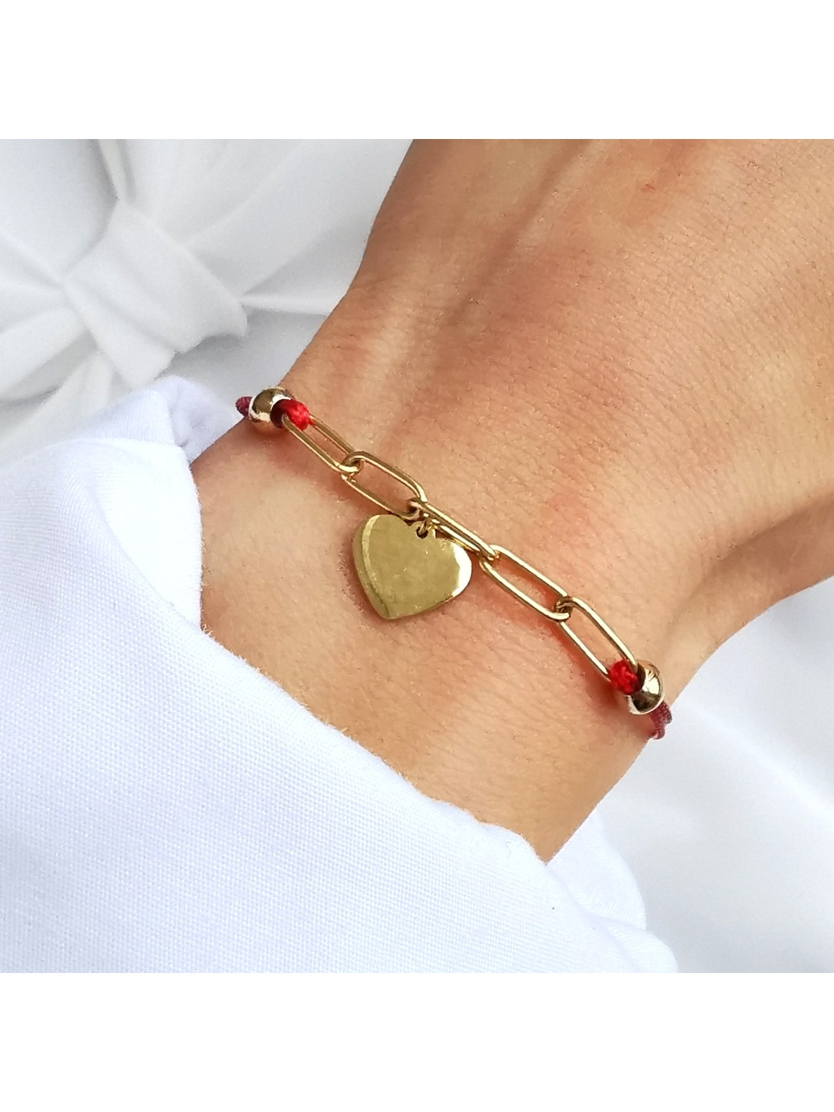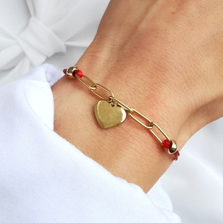 Bransoletka zapinana wykonana na czerwonym sznurku jubilerskim z wplecionym krótkim łańcuszkiem z przodu i serduszkiem zawieszonym na środku.