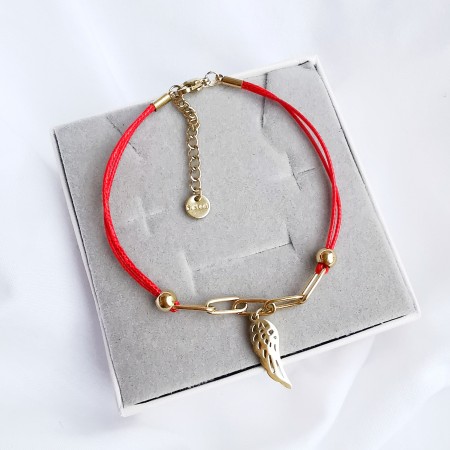 Bransoletka wykonana na czerwonym sznurku jubilerskim z krótkim łańcuszkiem pośrodku oraz zawieszką w kształcie skrzydełka.
