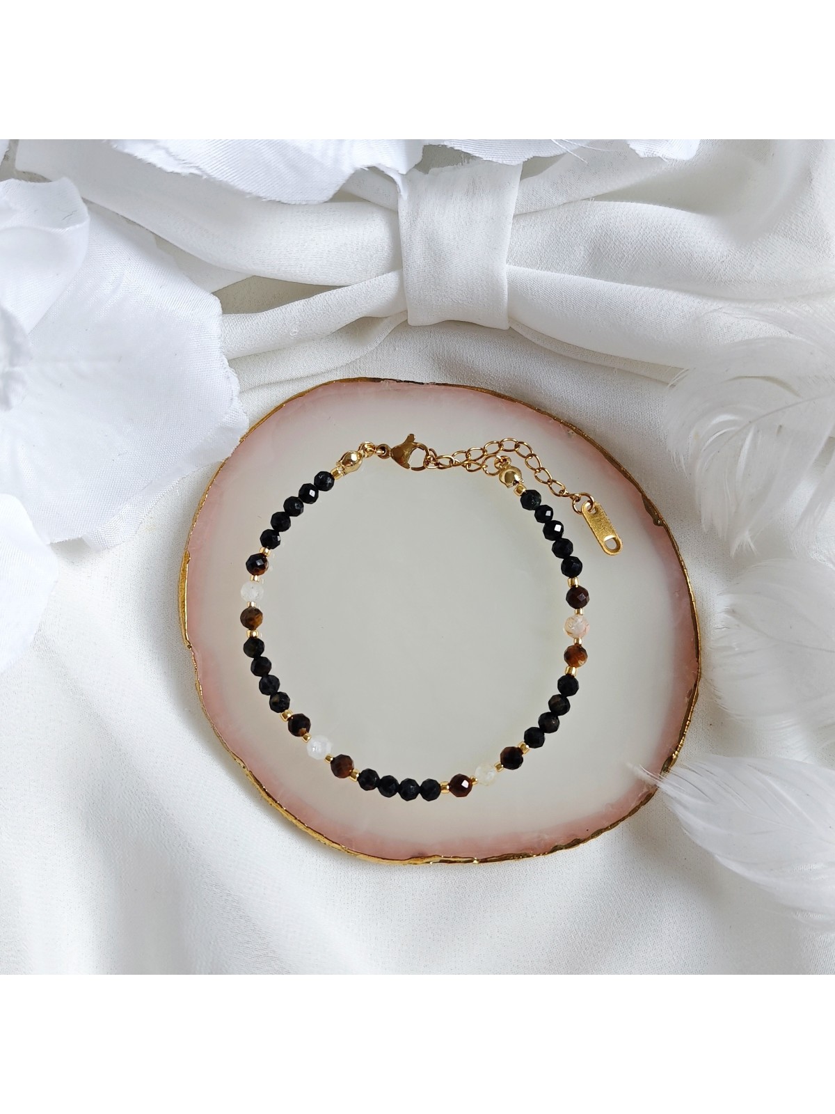 Połączenie tych kamieni tworzy bransoletkę, która wspiera ochronę, energię i stabilność w codziennym życiu.