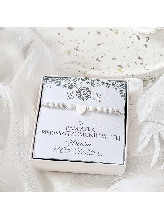 Nie zapomnij zapisać swojej personalizacji, aby móc dodać ją do koszykaBransoletka komunijna z serduszkiem z masy perłowej, jadeitem i howlitem – pamiątka I Komunii Świętej