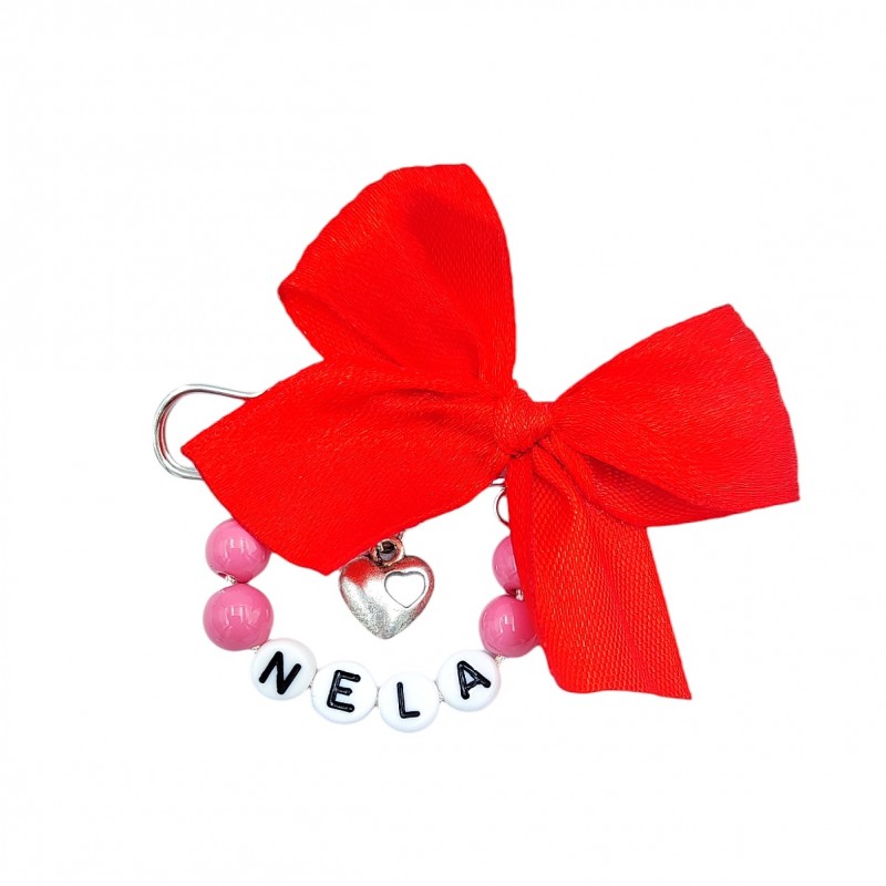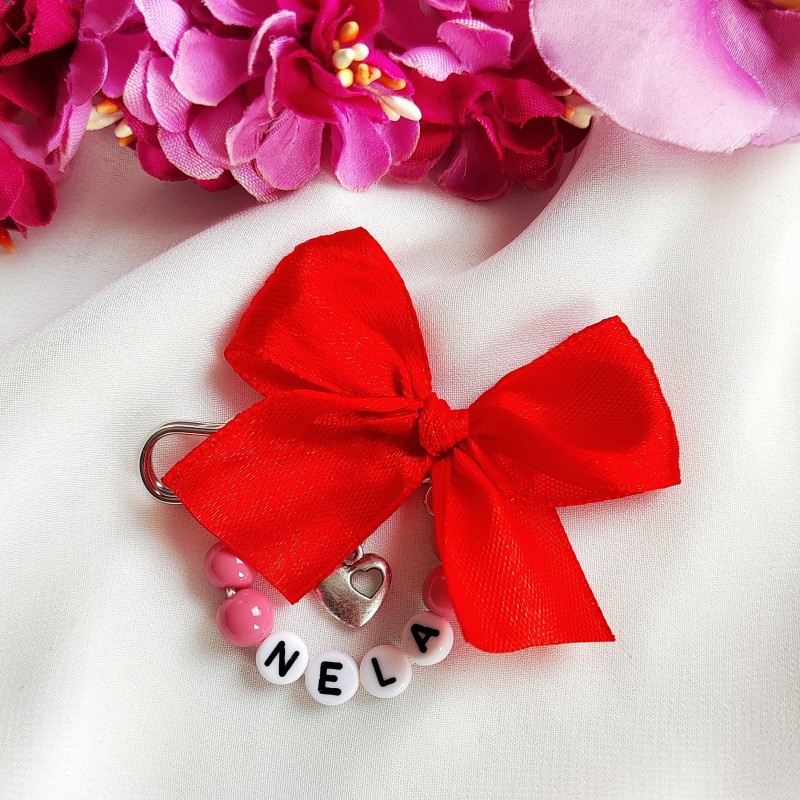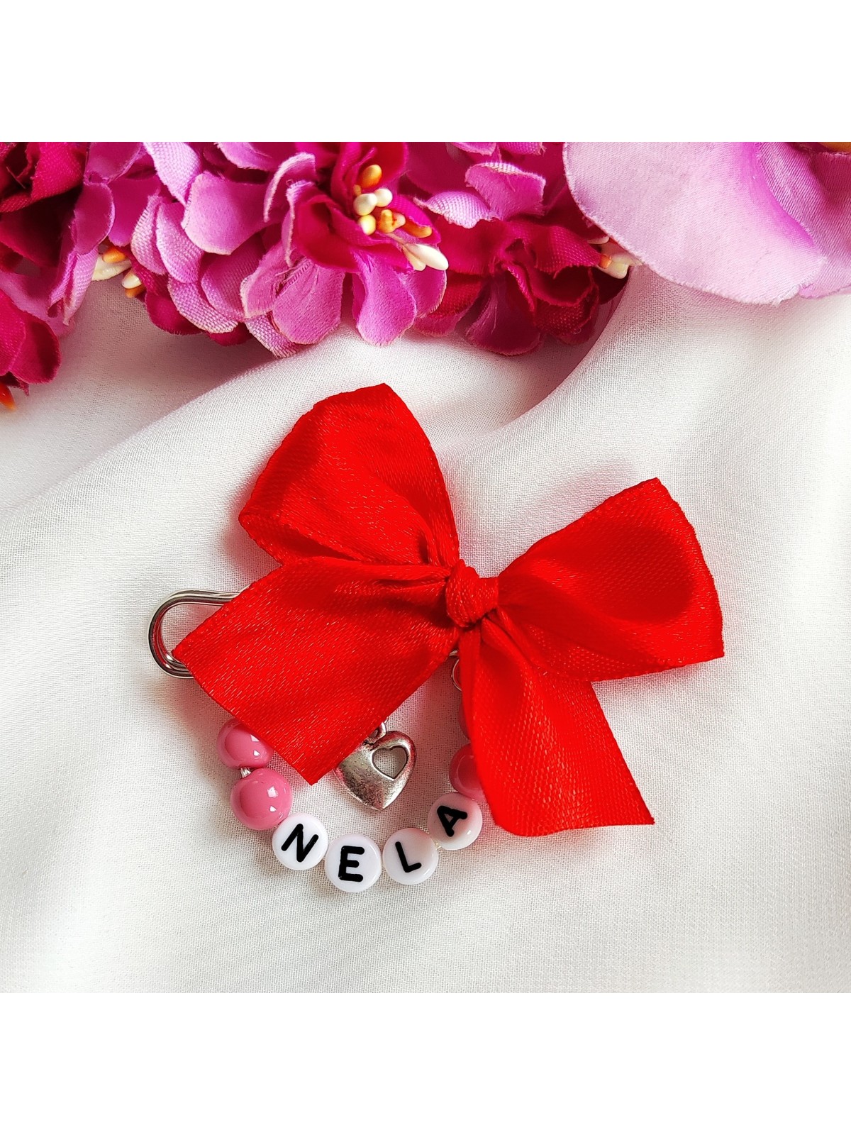 Agrafka do wózka z czerwona kokardką z imieniem Idealnie nadaje się jako prezent z okazji narodzin dziecka, chrztu, urodzin.