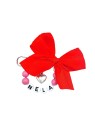 Personalizowana wykonana na zamówienie agrafka do wózka z imieniem dziecka i z czerwoną kokardką.