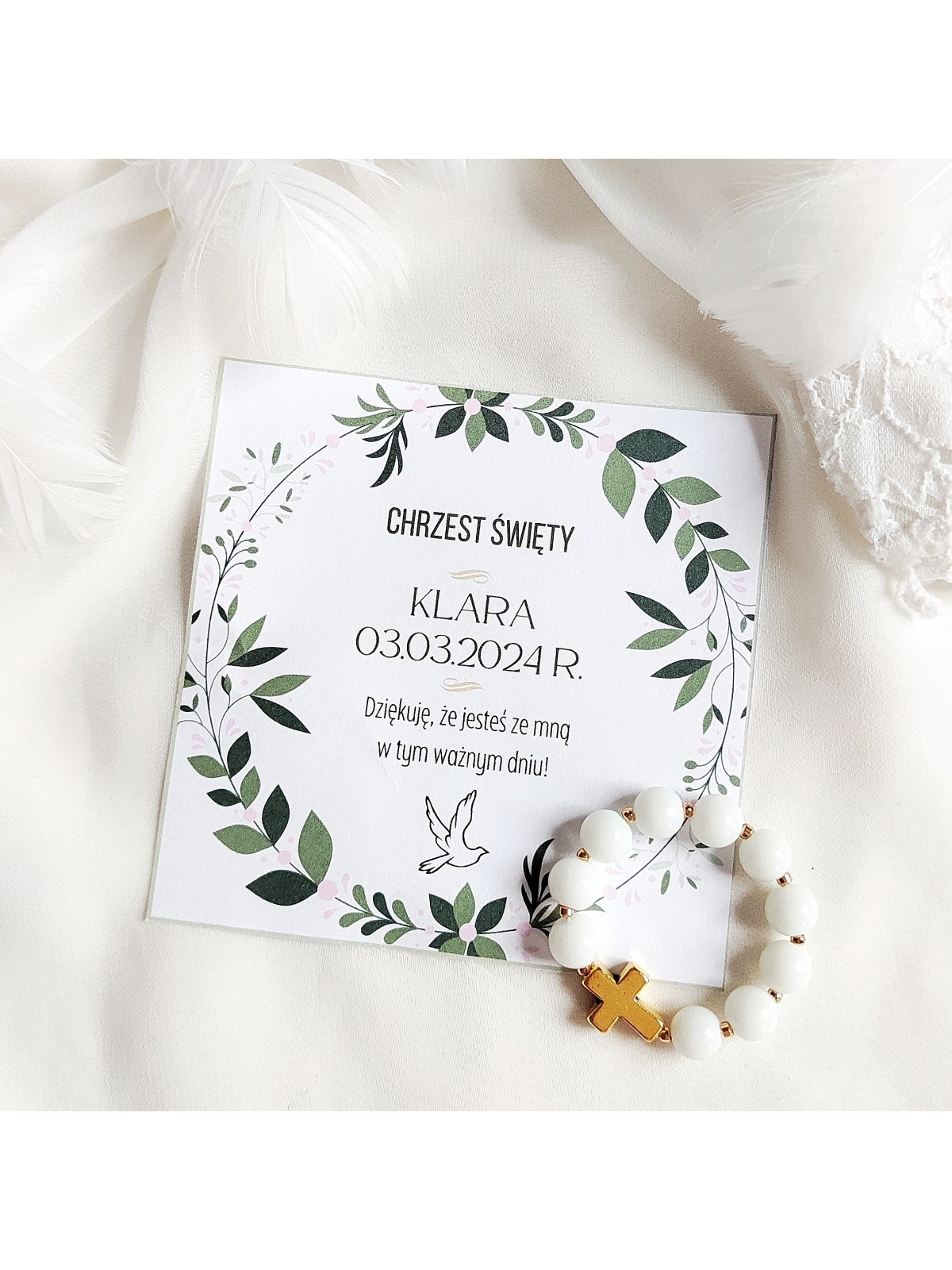 Różaniec z personalizowaną karteczką to wyjątkowe podziękowanie dla najbliższych za obecność na uroczystości Chrztu Świętego.