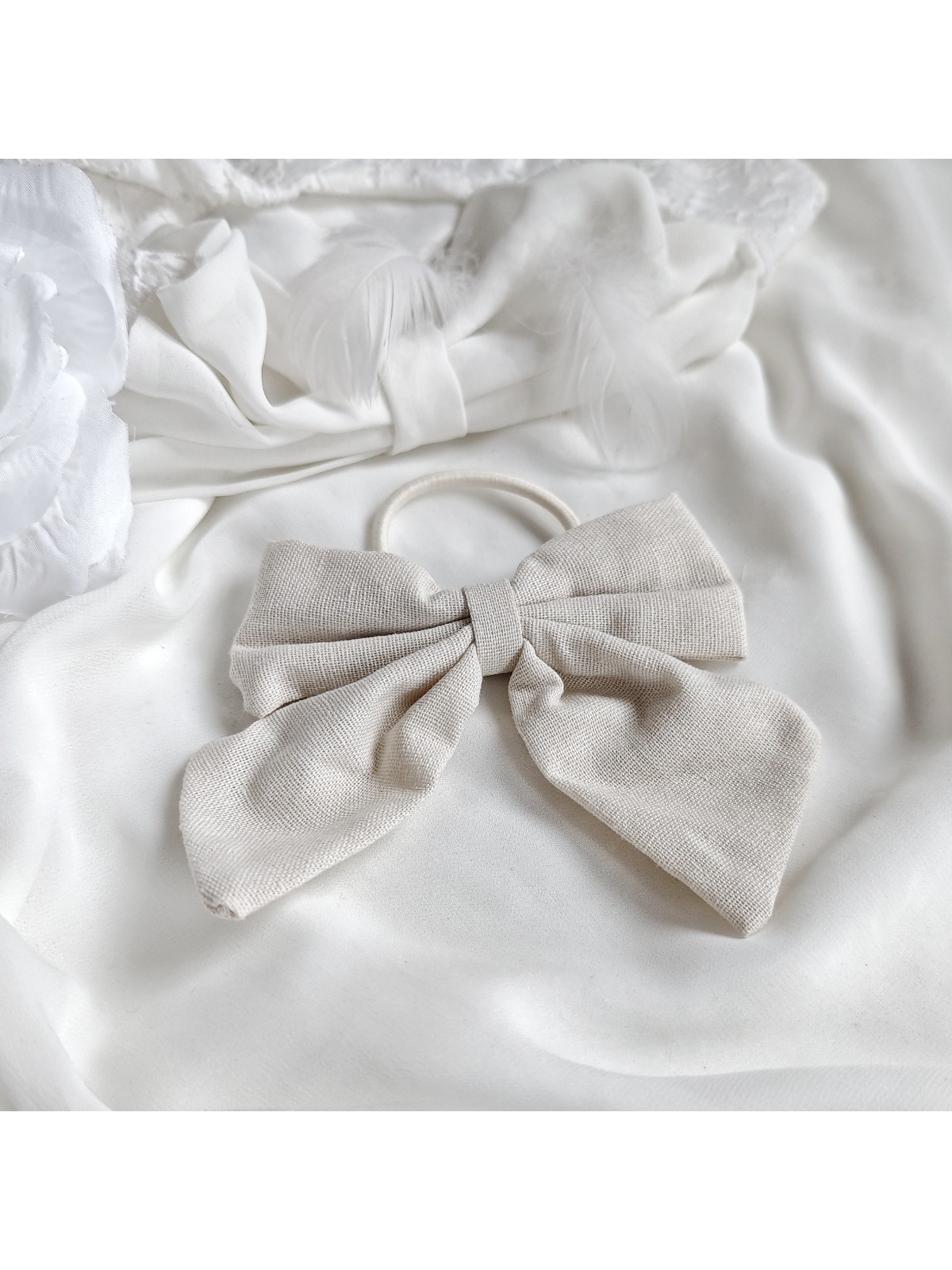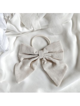 Gumka do włosów w kolorze beżowym i kremowym z kokardą to praktyczny dodatek do codziennych fryzur.