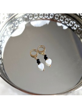 Kolczyki wykonane ręcznie z naturalnych kamieni onyksu i serduszek z masy perłowej to subtelne połączenie kontrastów – głębokiej czerni i perłowej bieli.