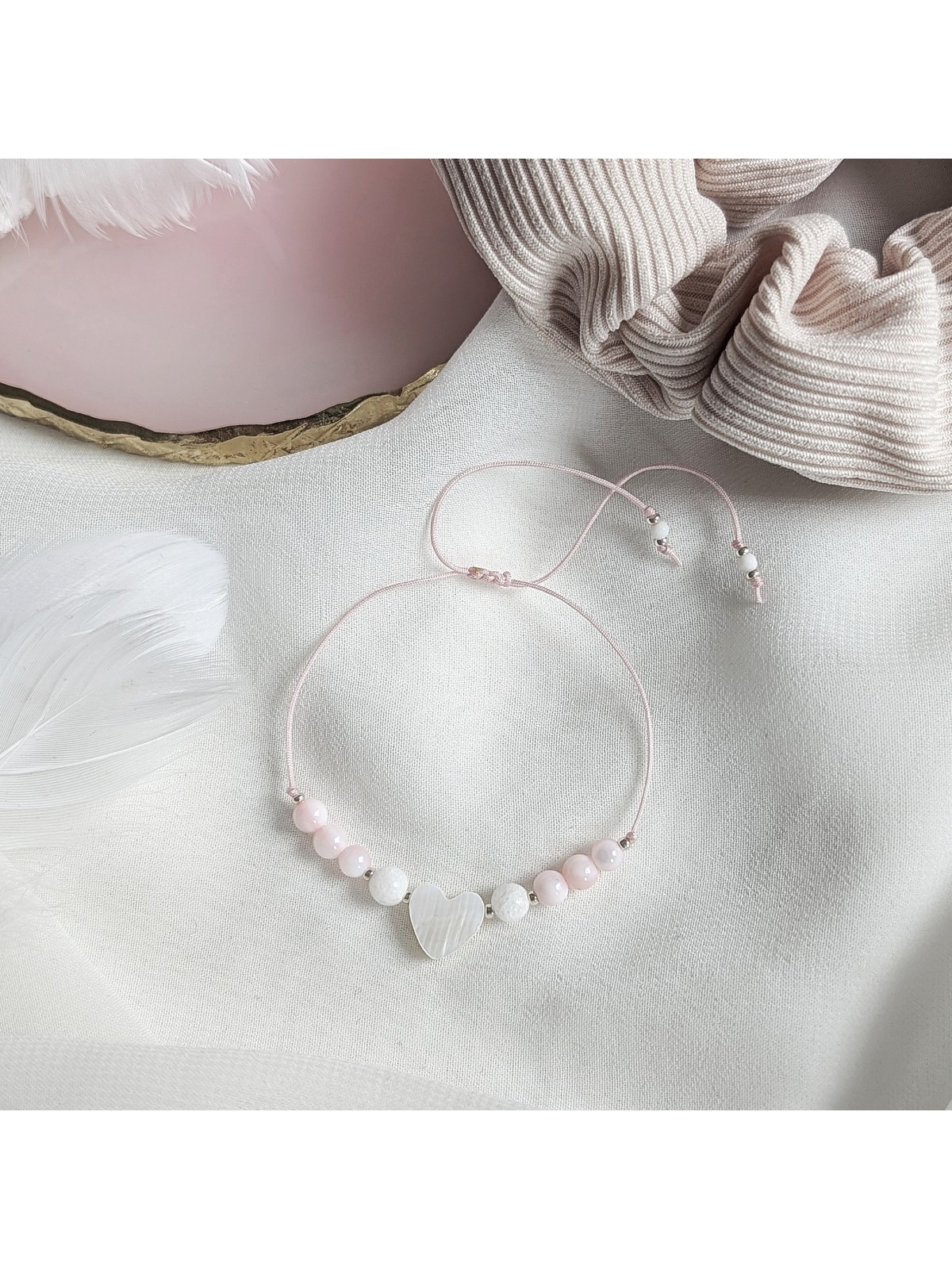 Bransoletka z białym Serduszkiem z masy perłowej z różowym Jadeitem