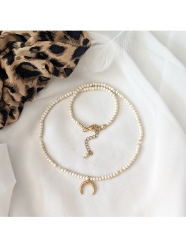 Zapięcie karabińczyk oraz zawieszka w kształcie półksiężyca wykonane są ze złotej stali chirurgicznej, co zapewnia trwałość i odporność.
