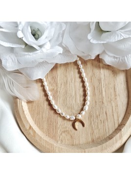 Naszyjnik z naturalnych pereł z zawieszką w kształcie półksiężyca to ręcznie wykonany projekt, łączący klasykę z symboliką natury.