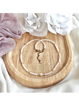 Naszyjnik wykonany ręcznie na zamówienie z drobnych, mlecznobiałych kryształków i naturalnej perły słodkowodnej.