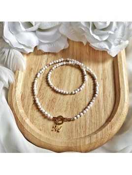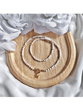 Drobne kamienie o wielkości ok. 3–4 mm tworzą naturalny łańcuszek, który dopełniają złote elementy – zapięcie typu toggle oraz zawieszka w kształcie literki, wykonane ze stali chirurgicznej.