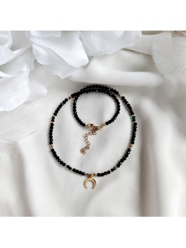 Naszyjnik z półksiężycem wykonany z turmalinu, granatu, szmaragdu i hematytu to propozycja dla osób, które szukają biżuterii z energią i głęboką symboliką.