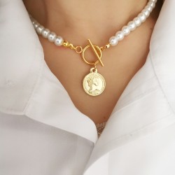 Naszyjnik z białych perełek z dodatkiem zawieszki złota MONETA.