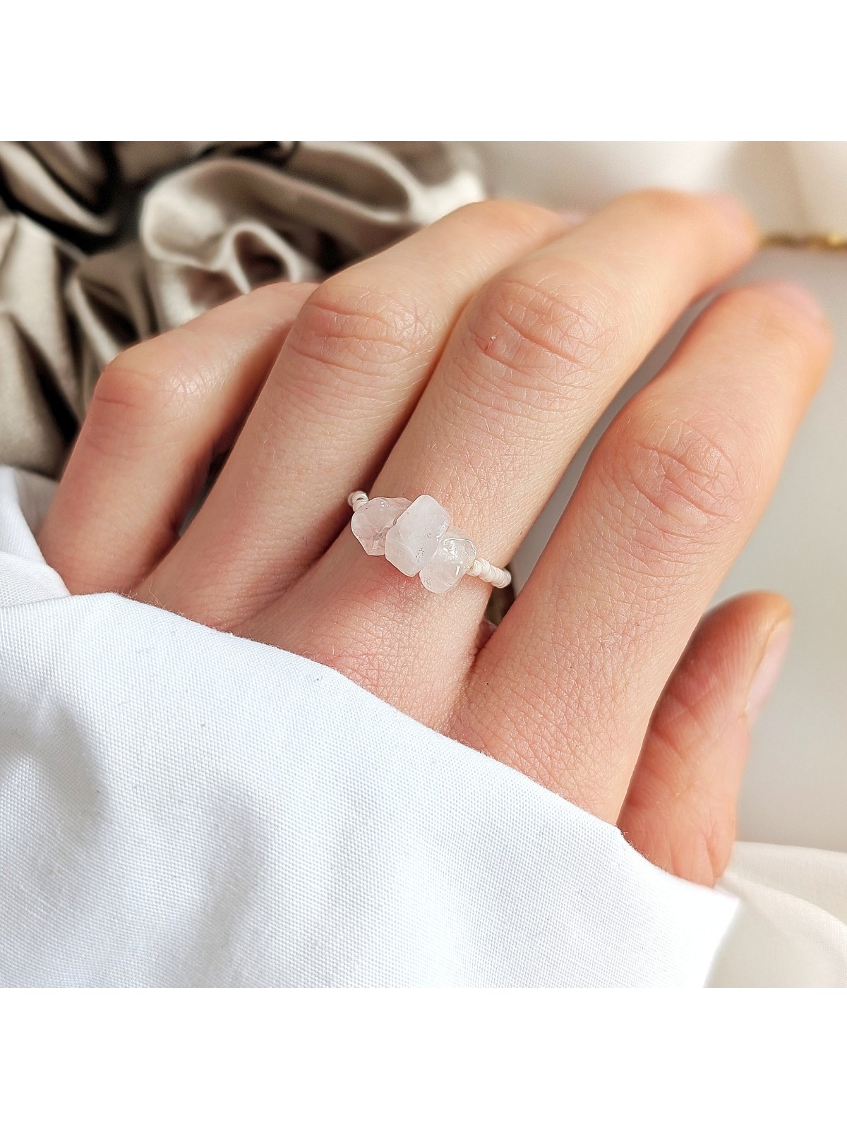 Pierścionek z koralików Toho i różowego kwarcu – ręcznie robiony, na elastycznej gumce